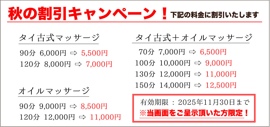 【タイ古式マッサージ】60分4,000円、90分6,000円、120分8,000円 |
